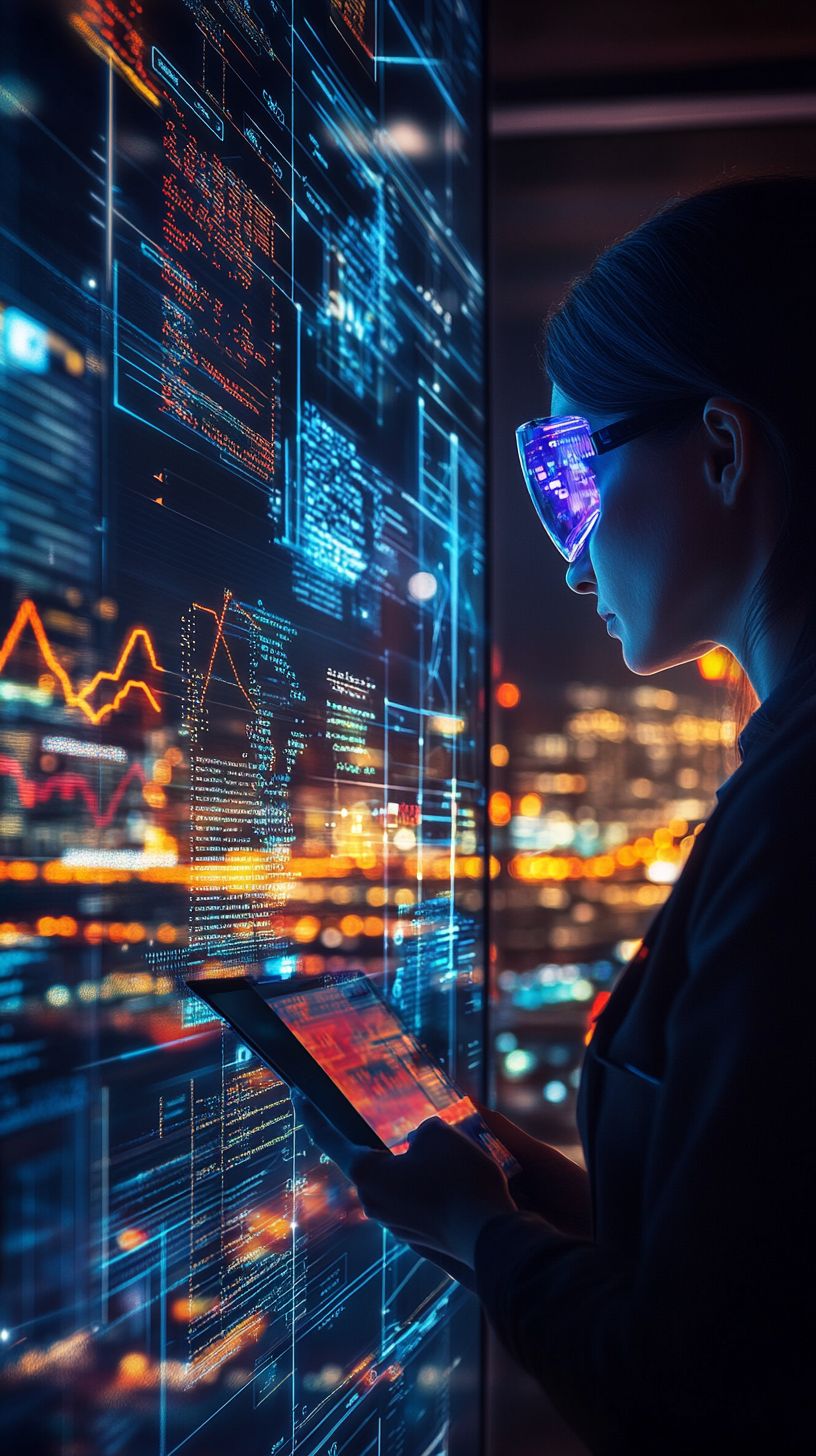 Idea para una imagen: una persona estudia herramientas digitales en una tableta, rodeada de infografías con datos sobre habilidades y servicios digitales, que simbolizan el aprendizaje y el desarrollo continuos.